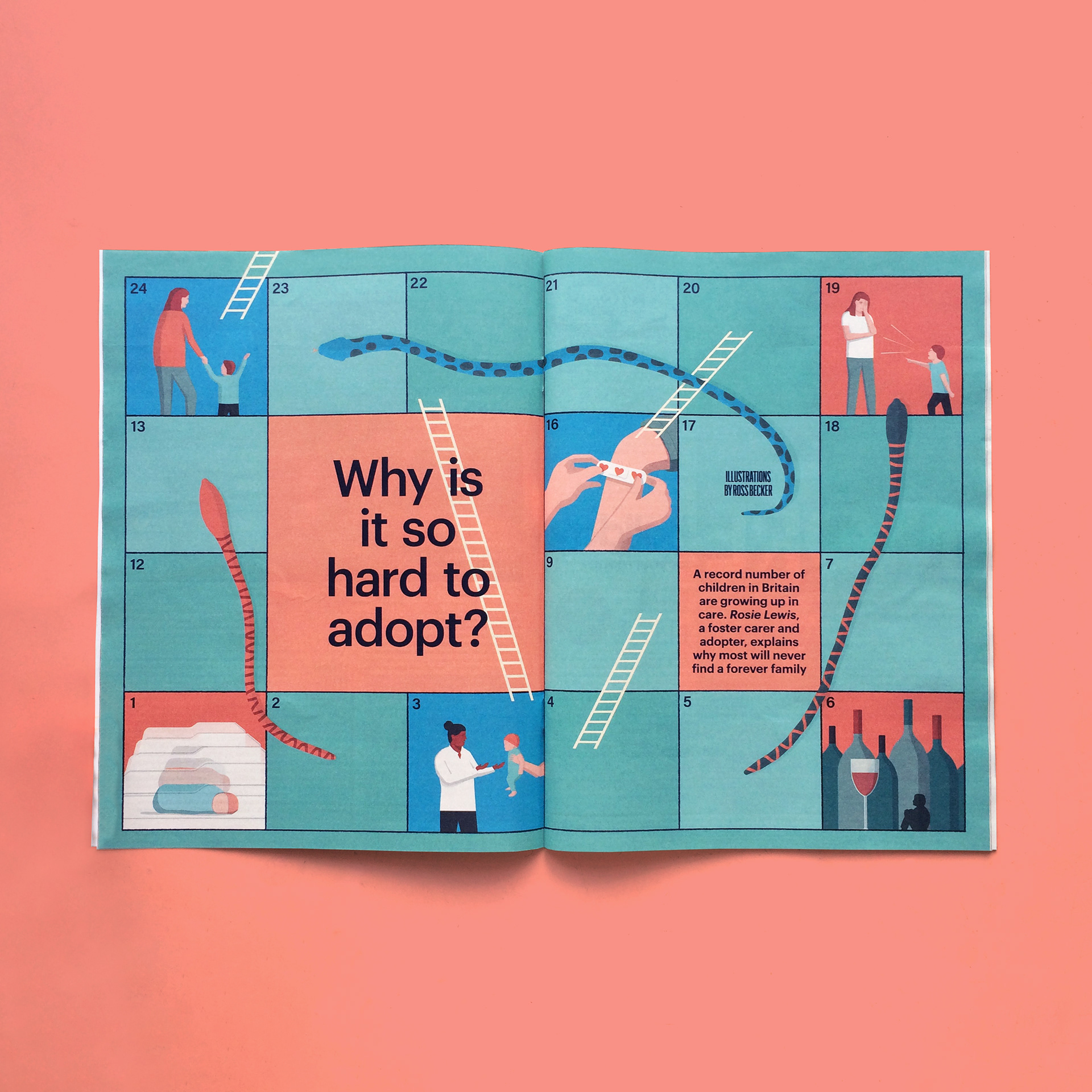 Double page illustration and spots for an article about the obstacles on the road to adoption in the UK