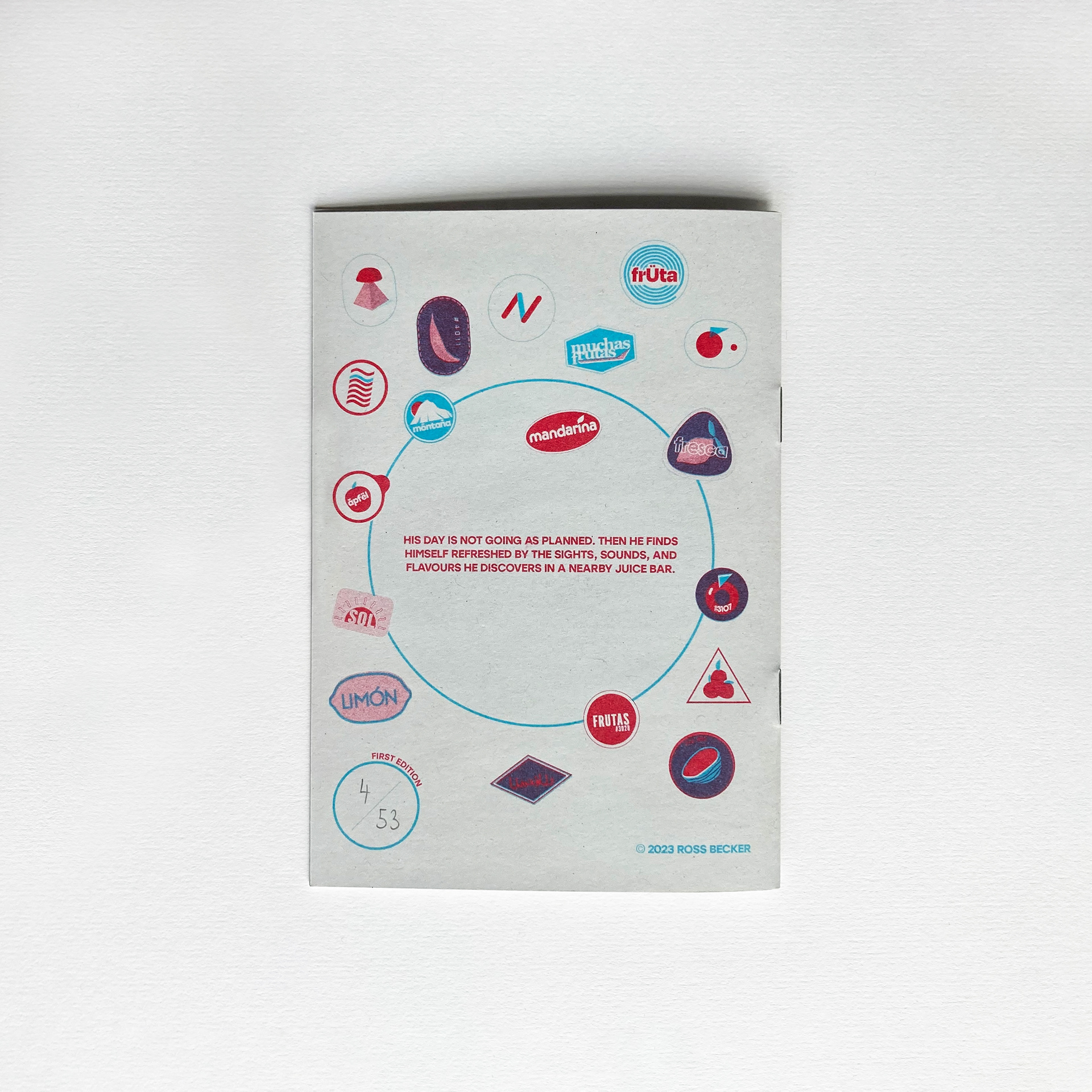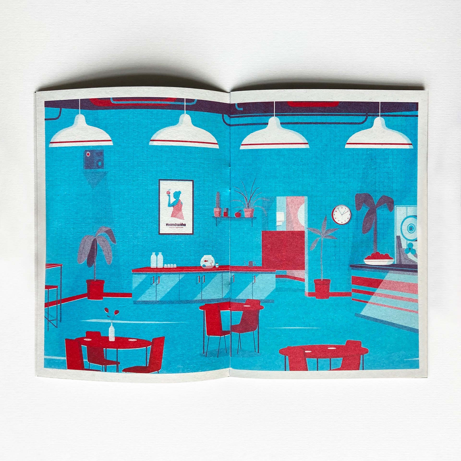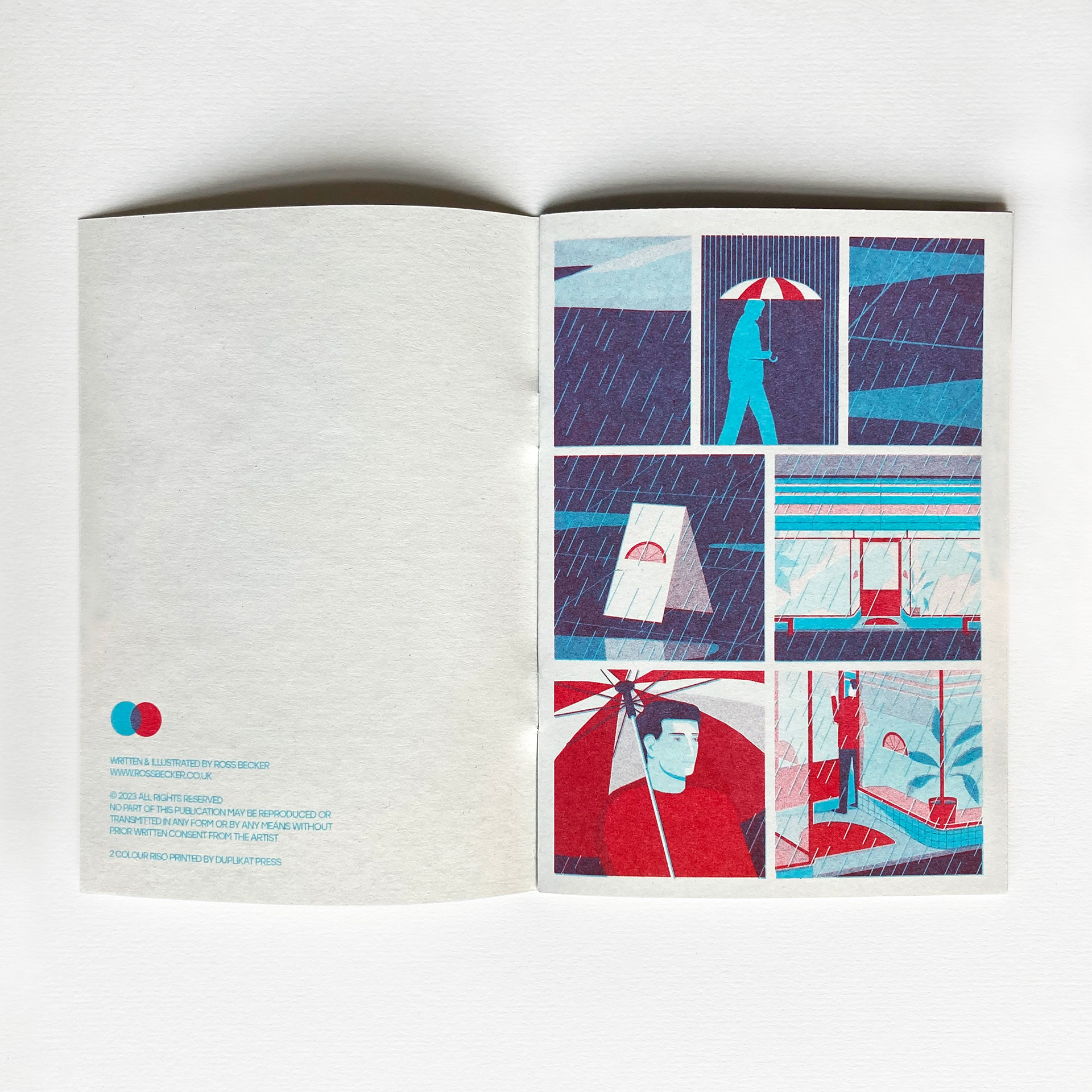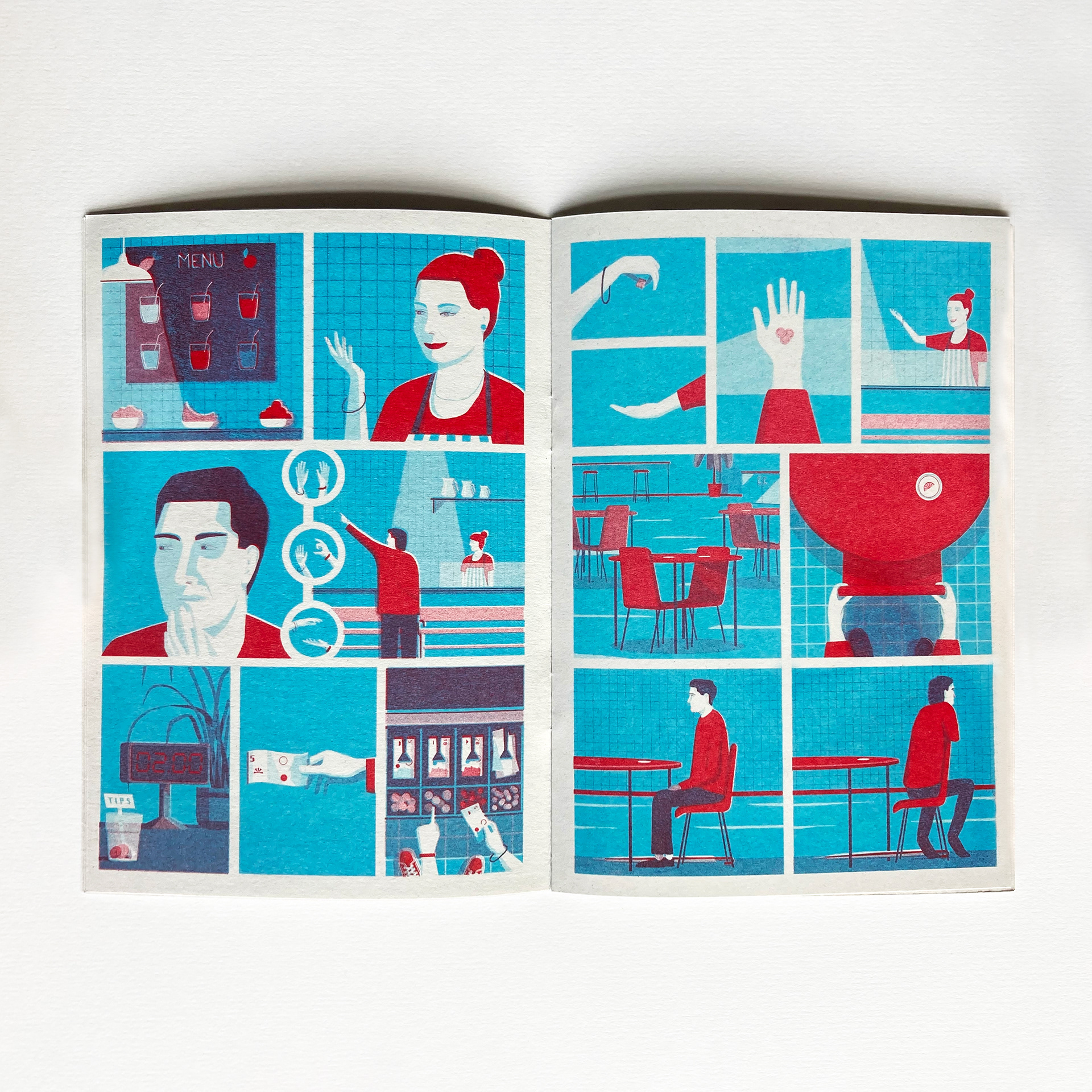 Selected pages from 'Juice Bar', a 16 page, 2 colour Riso-printed comic.